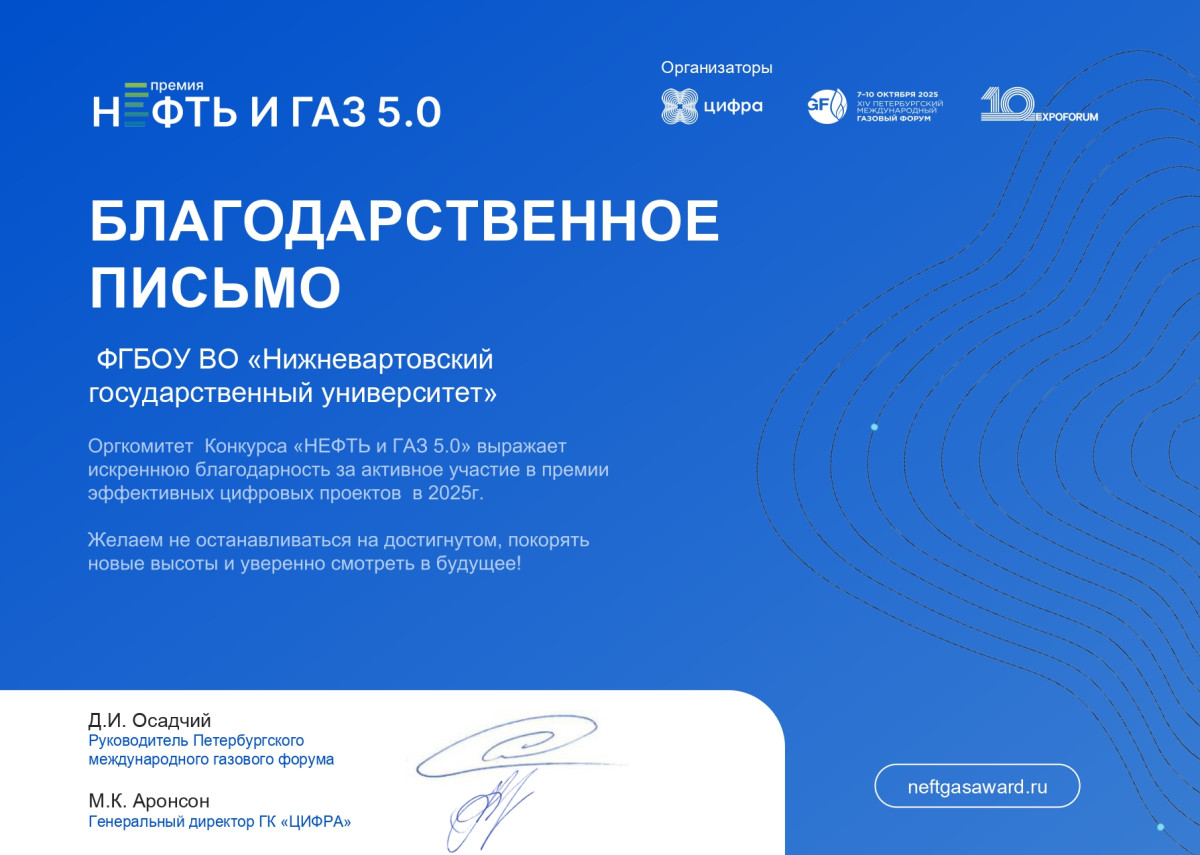 Благодарность Нижневартовскому госуниверситету от Премии «Нефть и газ»
