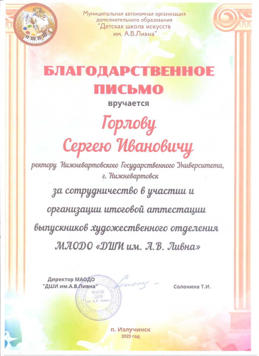 Благодарственное письмо ректору НВГУ Сергею Горлову