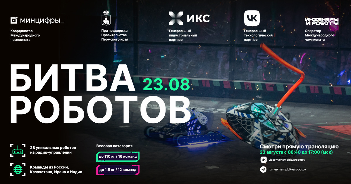 23 августа с 10:30 до 13:30 пройдет первый отборочный этап Международного чемпионата по битве роботов. Сразятся 28 команд из России, Казахстана, Ирана и Индии: 16 команд в рамках дисциплины «Битва роботов» в весовой категории до 110 килограмм и 12 команд в рамках дисциплины «Битва мини-роботов» в весовой категории до 1,5 килограмм.