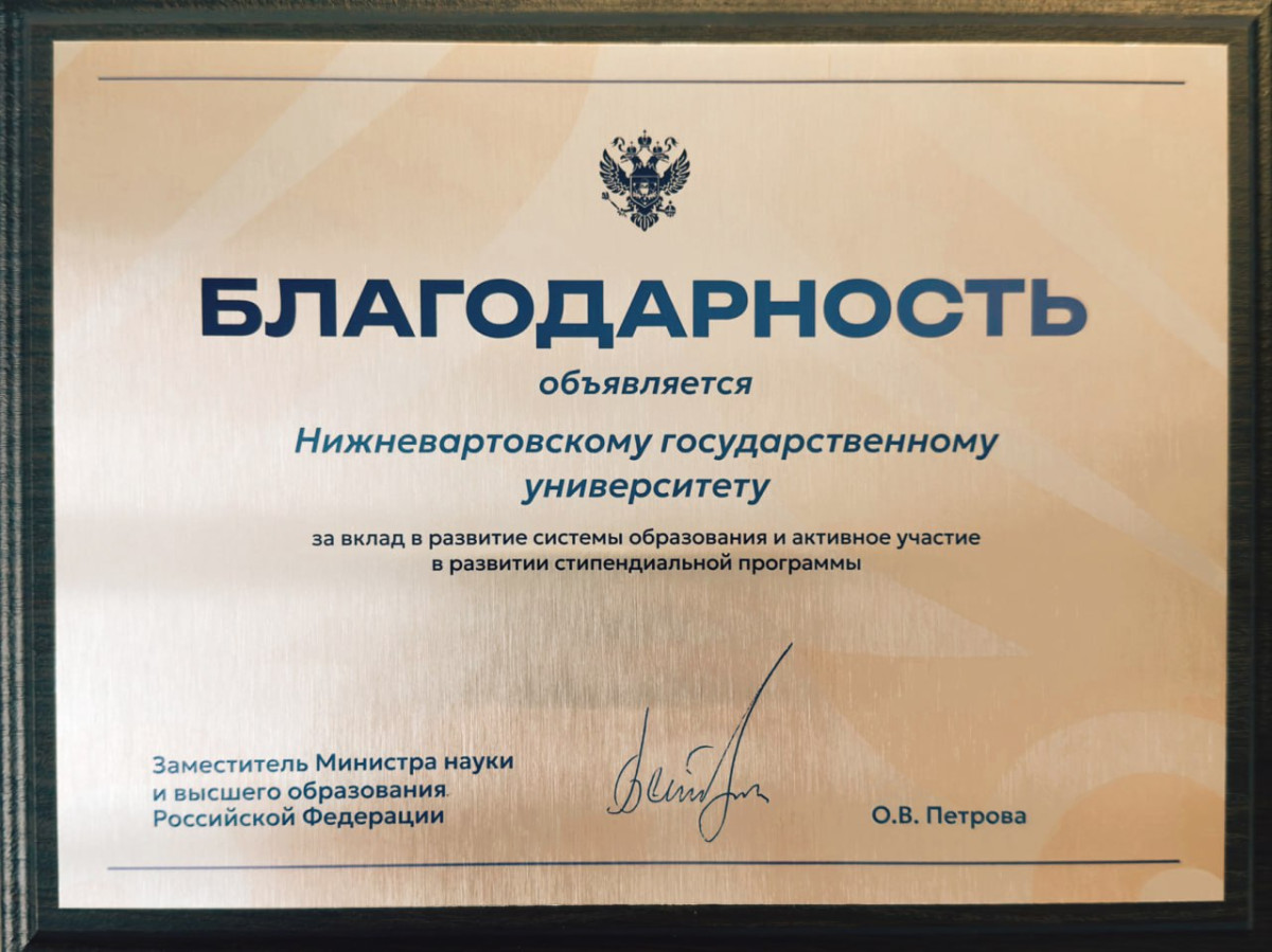 Министерство науки и высшего образования России объявило благодарность Нижневартовскому государственному университету за вклад в развитие системы образования и активное участие в развитии стипендиальной программы.