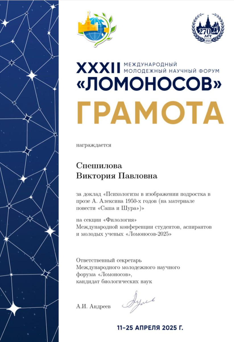 Доклад Виктории – «Психологизм в изображении подростка в прозе А. Алексина 1950-х годов (на материале повести «Саша и Шура»)» – экспертным советом секции «Филология» конференции «Ломоносов-2025» признан одним из лучших и отмечен грамотой.