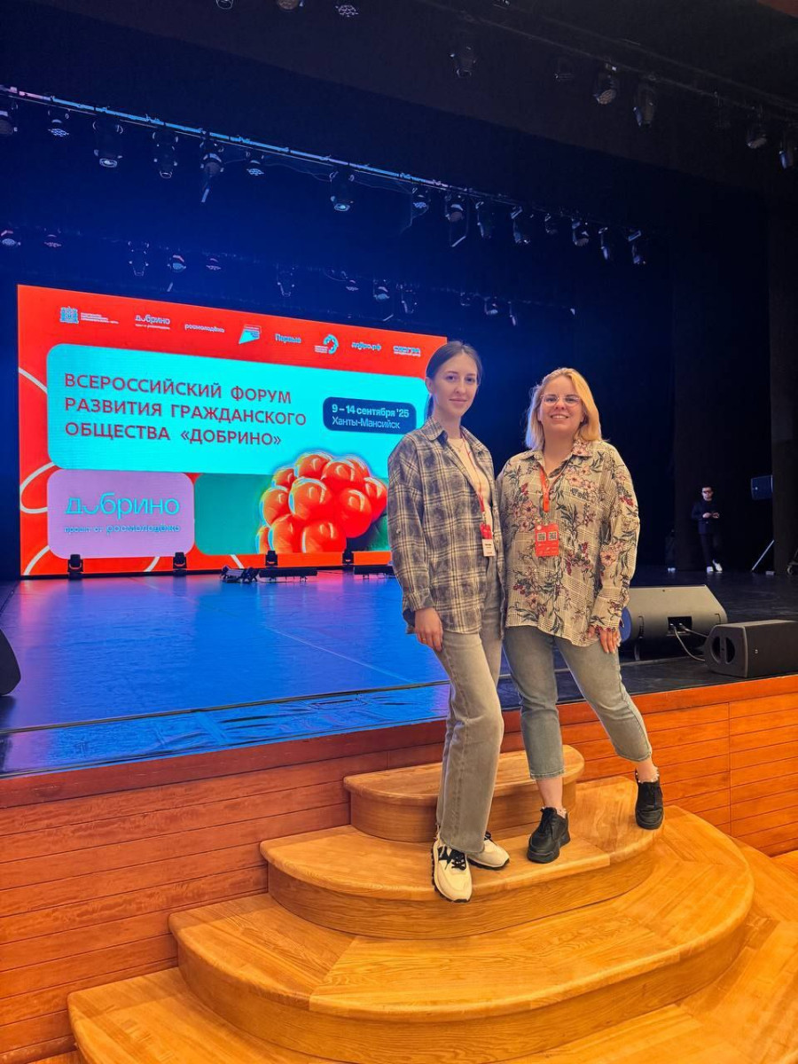 Арина Газиева, преподаватель кафедры экономических и социально-гуманитарных наук, и Виктория Стексова, ассистент кафедры педагогики и педагогического и социального образования, в столице Югры на Всероссийском форуме развития гражданского общества «Добрино».