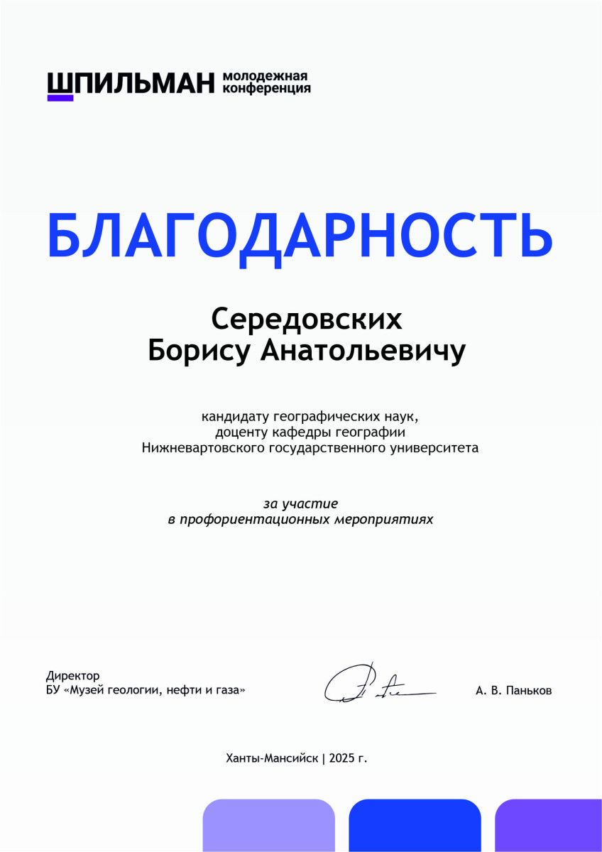 Борис Середовских, доцент кафедры географии, представил доклад на Всероссийской молодежной конференции имени Владимира Шпильмана «Проблемы рационального природопользования и история геологического поиска в Западной Сибири». Преподаватель НВГУ доказал актуальность направления подготовки специалистов для Югры, реализуемого Нижневартовским госуниверситетом, «Природообустройство и водопользование (природоохранное обустройство территорий)».