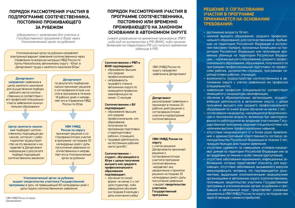 Для участия в программе необходимо обратиться в консульские учреждения РФ на территории проживания. При наличии у соотечественников разрешения на временное проживание в Российской Федерации (в том числе в целях получения образования), либо вида на жительство в Российской Федерации достаточно связаться с УМВД России по автономному округу.