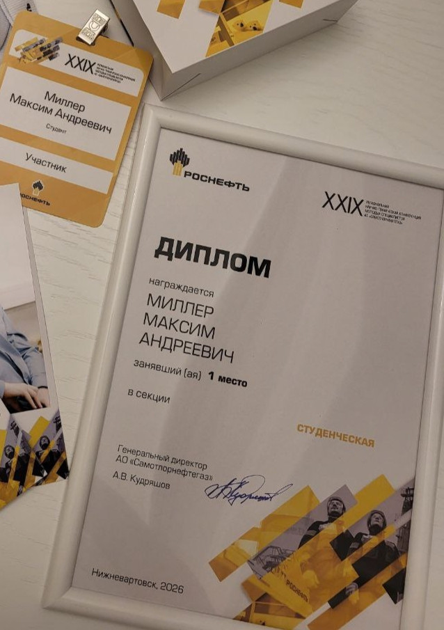 Инновационная работа молодого исследователя направлена на повышение экологической безопасности и операционной эффективности трубопроводного транспорта. Предложенный метод позволяет с высокой точностью локализовать повреждения инфраструктуры, используя спектральный анализ звуковых и волновых колебаний, возникающих в системе. Председатель и члены жюри АО «Самотлорнефтегаз» отметили не только научную новизну работы Максима, но и её практическую значимость — возможность интеграции метода в действующие системы предприятия.