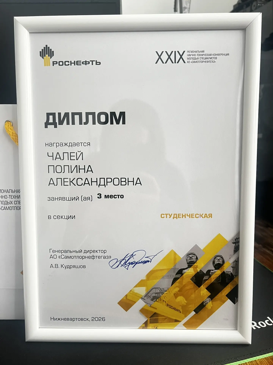 Полина Чалей, магистрант 2 курса, заняла на конференции 3 место. Ее доклад на тему «Управление утилизацией буровых отходов: оценка масштабов, подбор технологий и контроль эффективности утилизации» был отмечен членами жюри за комплексный подход и прикладной характер исследования.