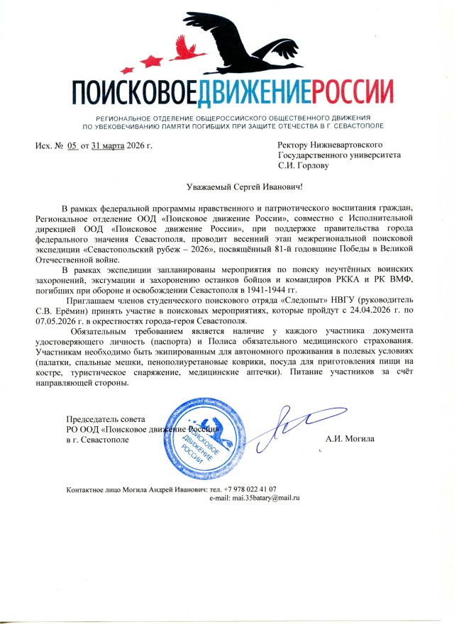 Студенты НВГУ, члены СПО «Следопыт» Абдулгани Сагдаров, Михаил Бударин и Владислав Салмин приняли участие в открытии патриотической акции «Югра — Вахта Памяти 2026». Это событие традиционно объединило тех, кто делом доказывает преданность истории своей Родины и подвигу народа в Великой Отечественной войне 1941-1945 гг. Мероприятие стало и своеобразными проводами нижневартовских поисковиков на весенний этап «Вахты Памяти», которая традиционно начинается в апреле в российских регионах, где в годы Великой Отечественной войны проходили боевые действия. Большинство нижневартовских поисковых отрядов на днях выезжают в Волгоградскую область. Университетские поисковики отправятся в город-герой Севастополь, в межрегиональную поисковую экспедицию "Севастопольский рубеж" в конце этой недели.