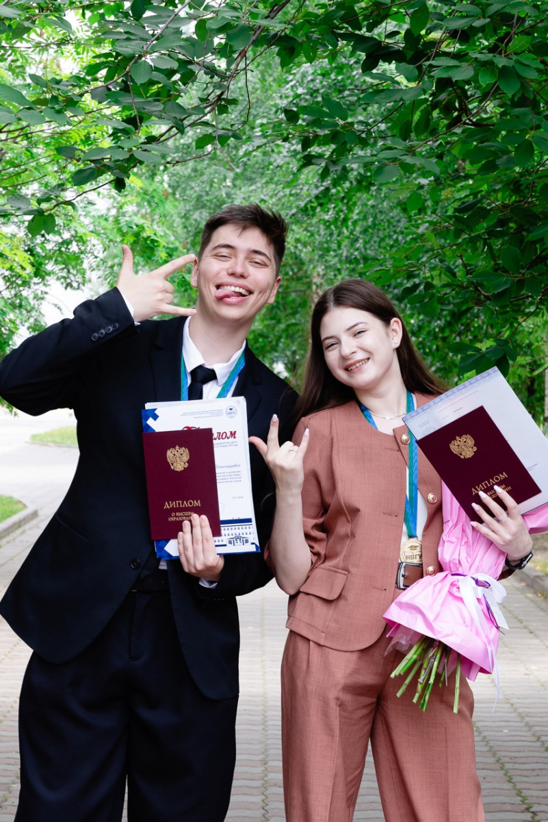«Ну что, наконец-то мы получили долгожданные медали, мы очень сильно все этому рады, наконец-то свершилось. Хотим сказать большое спасибо факультету информационных технологий и математики. Собираемся дальше поступать на магистратуру, конечно же, на наш любимый», – отметил Владислав Бобов, выпускник НВГУ.
